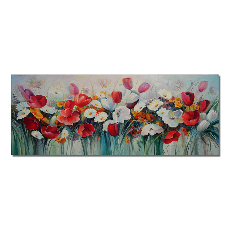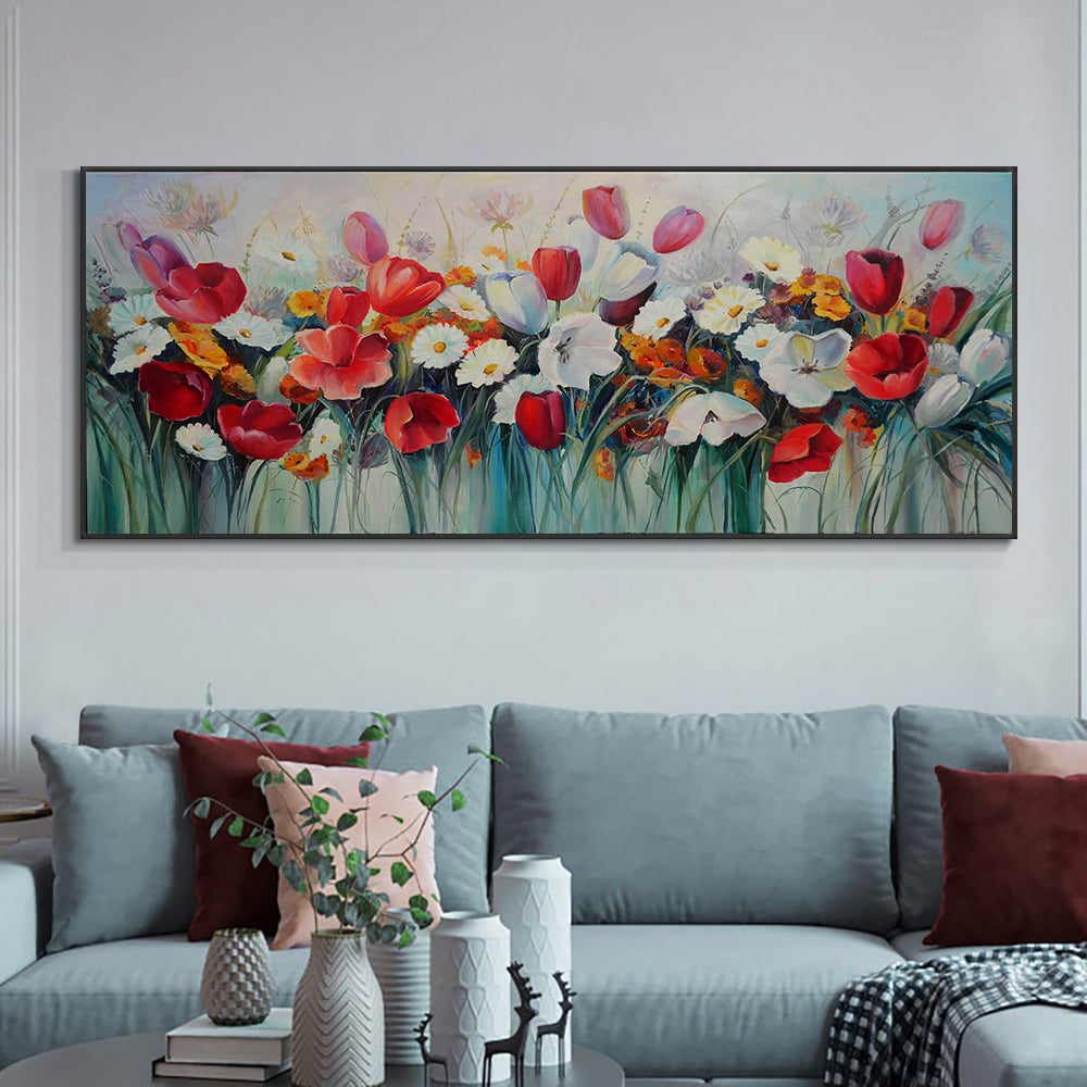 #420Abstract White Red Flowers Oil Painting Handmade On Cotton Canvas Modern Hand Painted Wall Art,27inx54in,No Frame