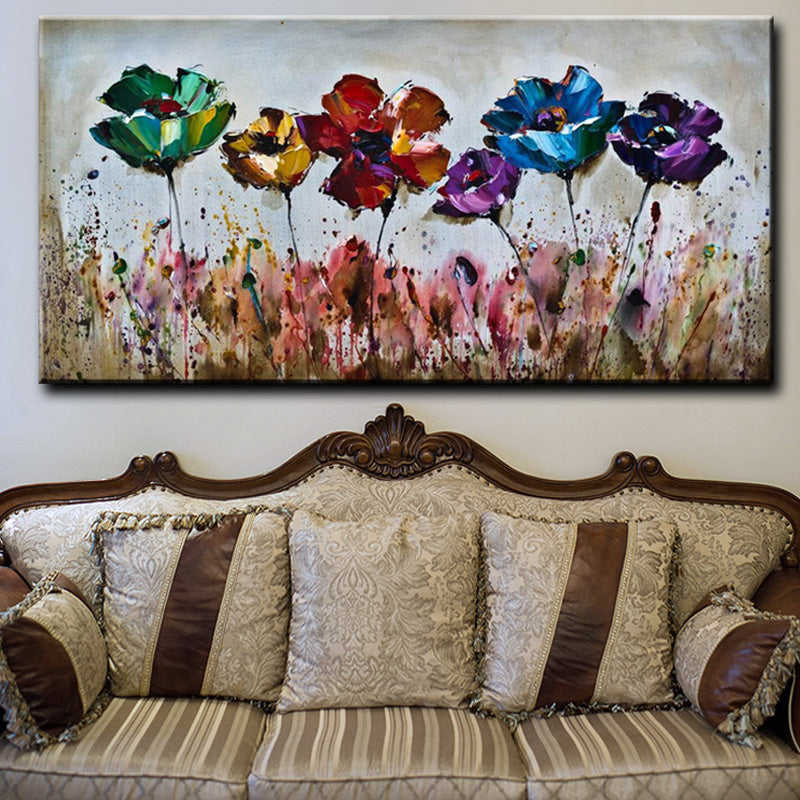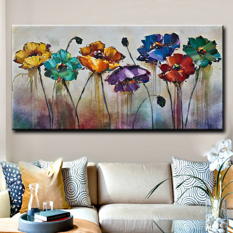 Abstract 7 Different Colors Flowers Oil Painting Hand Painted On Canvas Modern Handmade Wall Art,27inx54in,No Frame