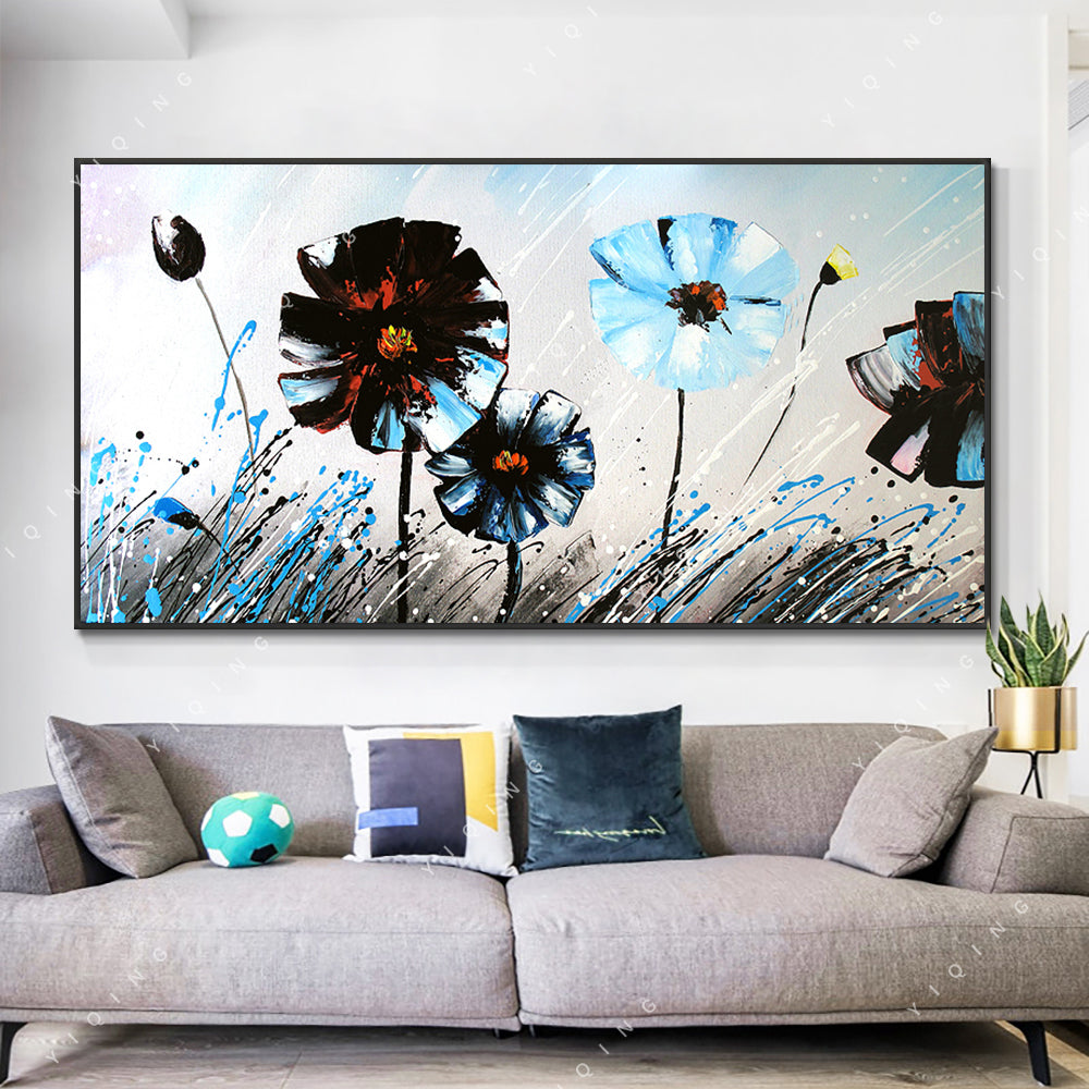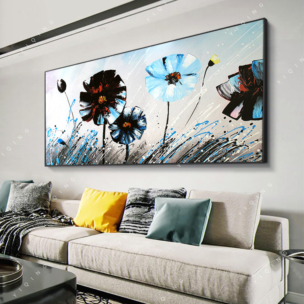 Abstract Blue Black Flowers Oil Painting Hand Painted Plant Painting On Canvas Modern Wall Art,27inx54in,No Frame