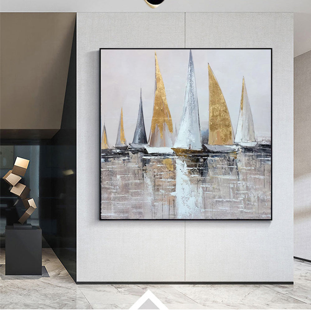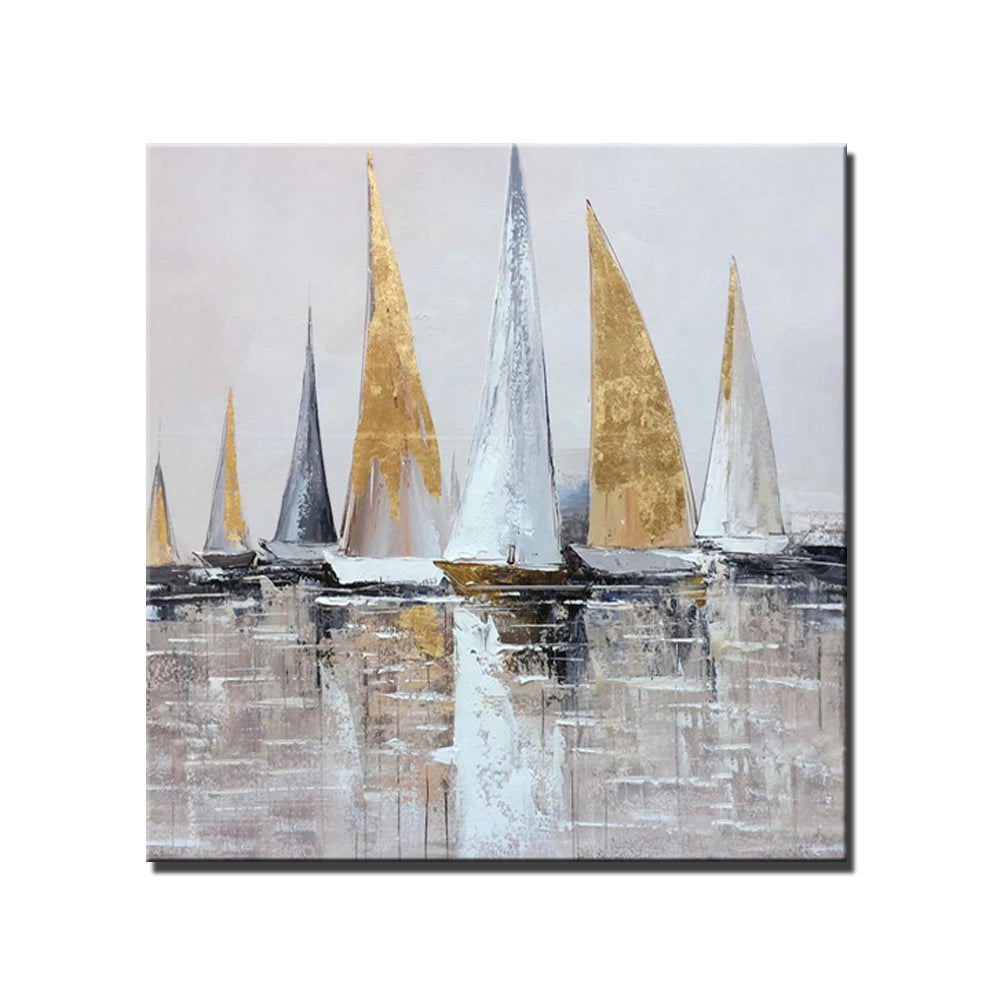 Abstract Canvas Oil Painting Hand Painted Landscape Gold Sailing Boat Home Mural Large Size Handmade Decoracion,31inx31in,No Frame