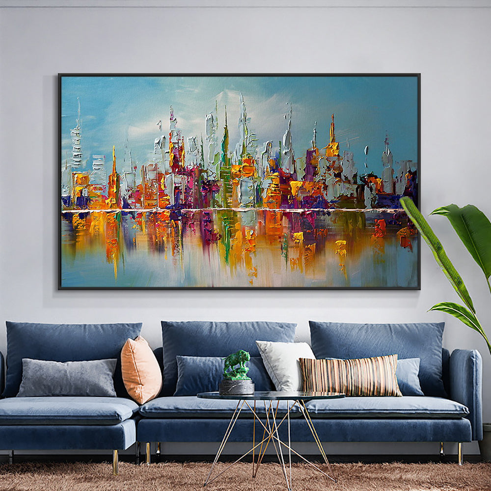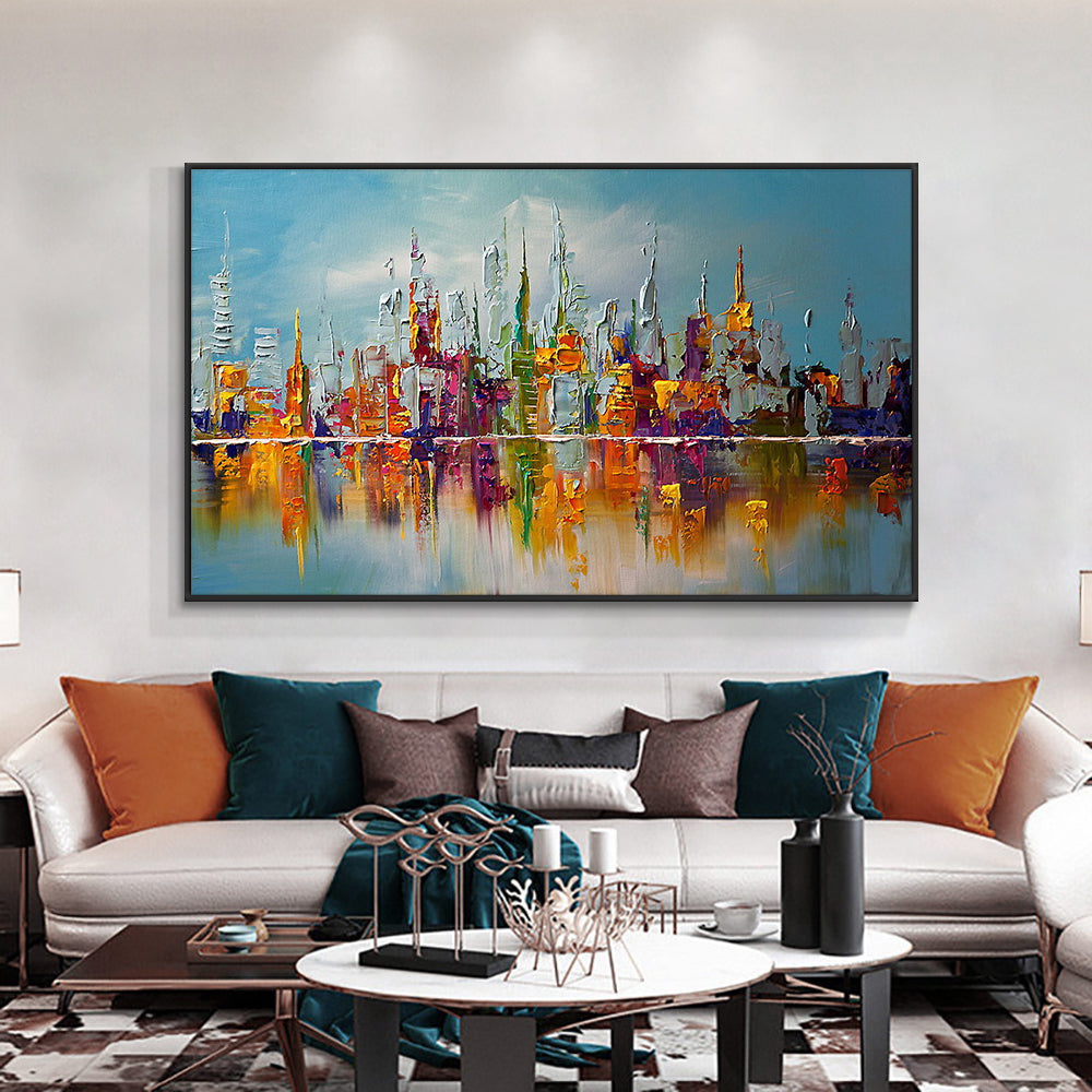 Abstract Colorful Large City Building Painting Handpainted Oil Painting On Canvas Modern Wall Art Painting,27inx54in,No Frame
