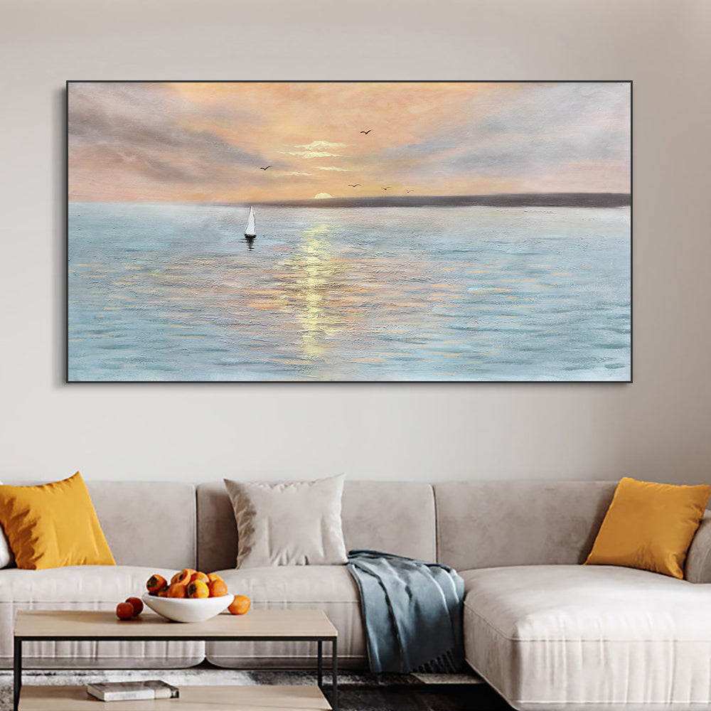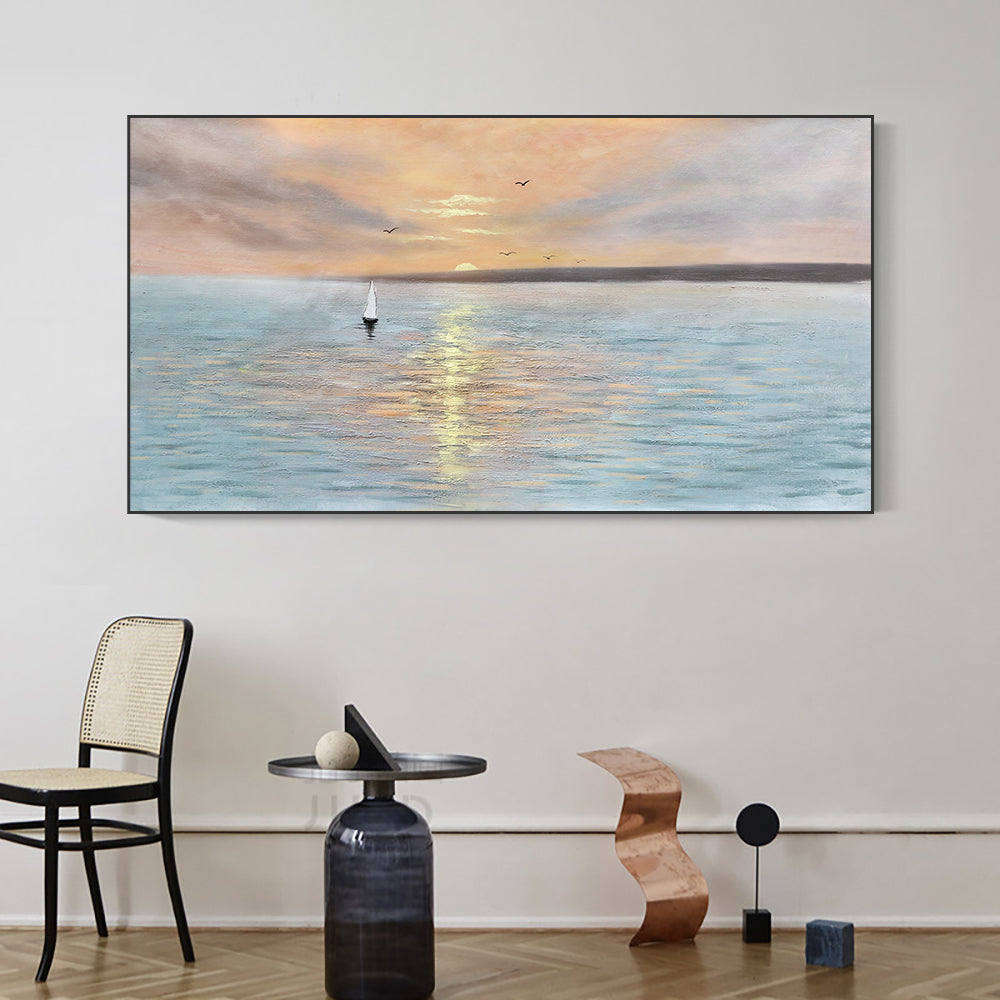 Abstract Landscape Hand Painted Oil Painting Sailboat and Sunset Canvas Picture Wall Art Seascape Painting,27inx54in,No Frame