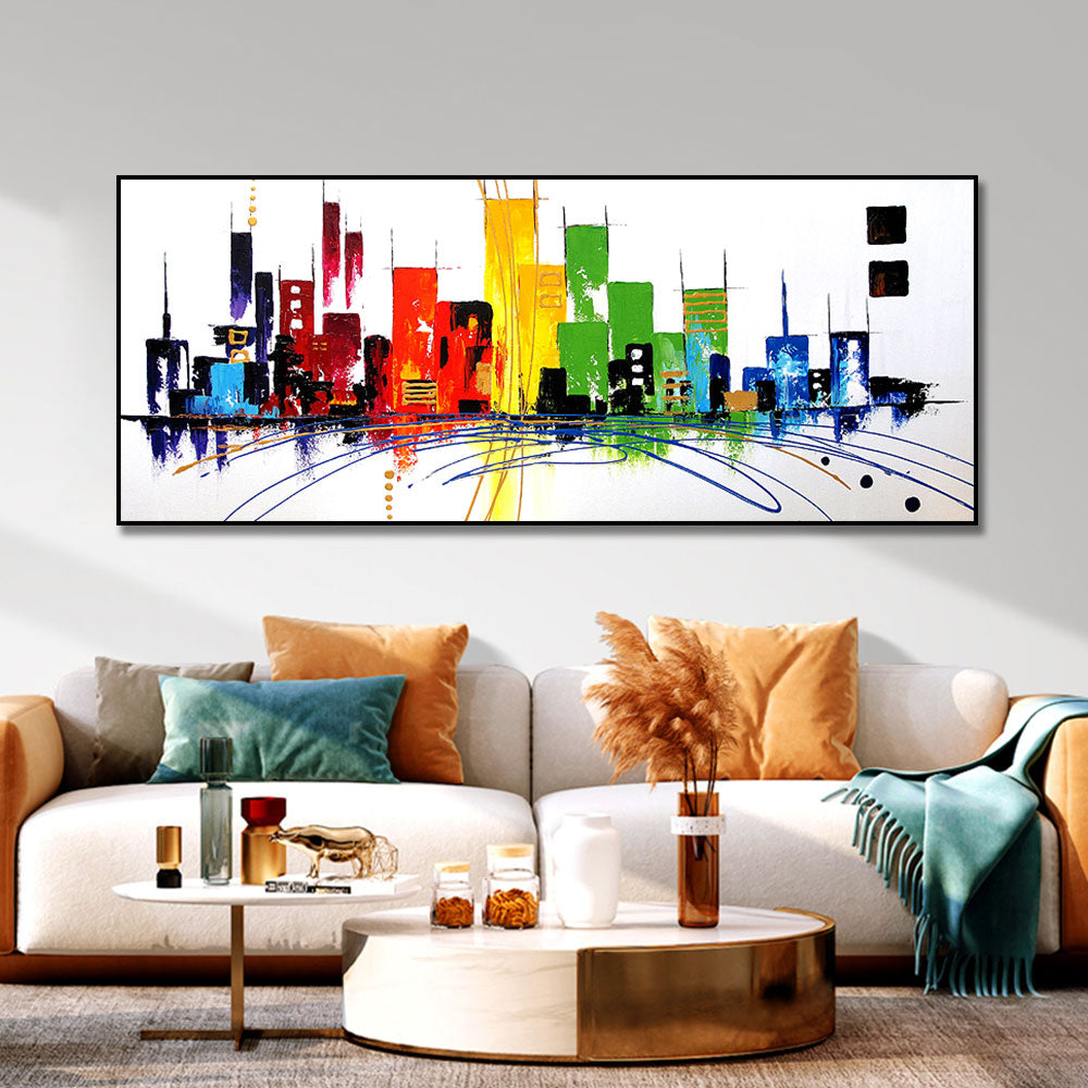 Hand painted Abstract Landscape Oil Painting Colorful Mordern Building Wall Art Handmade Canvas Painting for Living room,27inx54in,No Frame