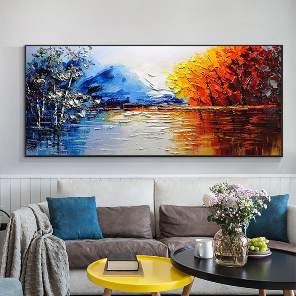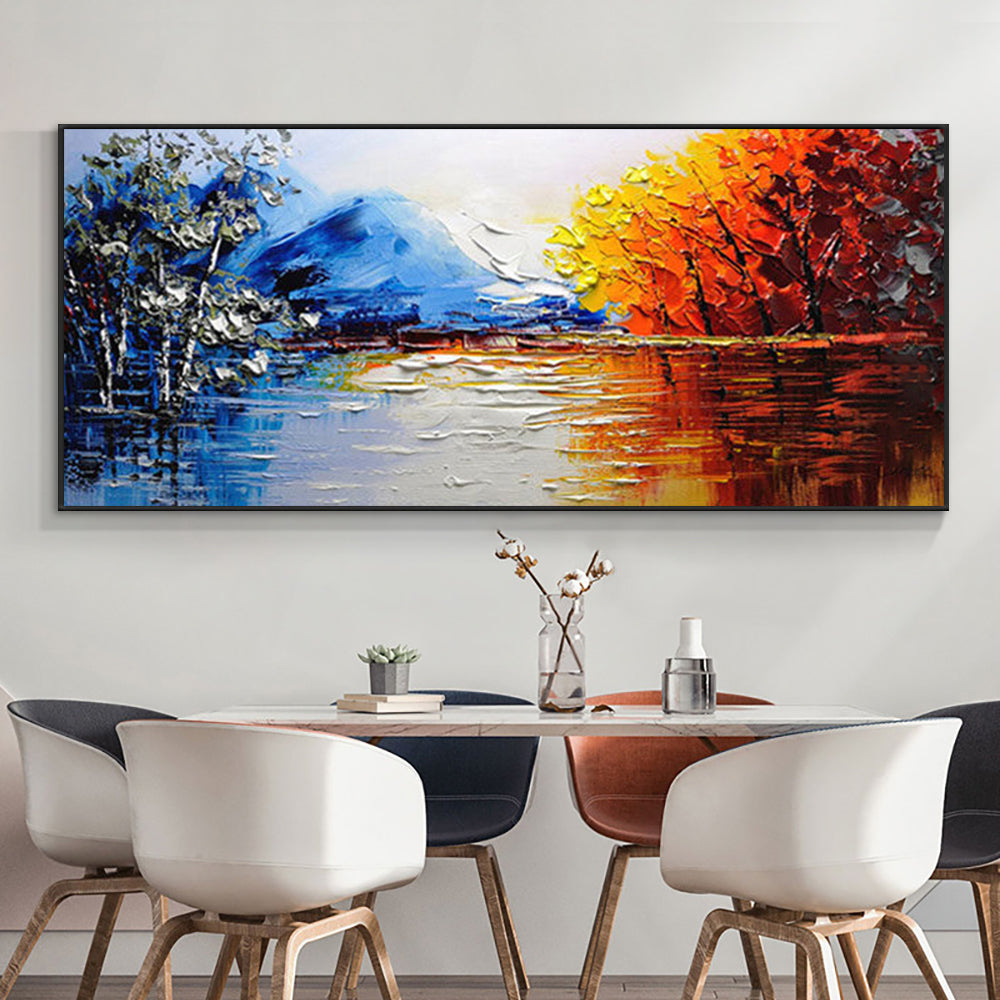 Hand painted Abstract Landscape Oil Painting Wall Art Handmade Red Tree Mountain Canvas Oil Painting,27inx54in,No Frame