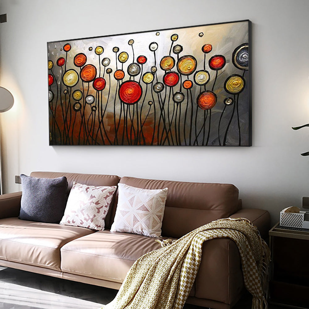 Hand Painted Abstract Red Yellow Round Flowers Oil Painting On Canvas Thick Knife Painting Wall,27inx54in,No Frame