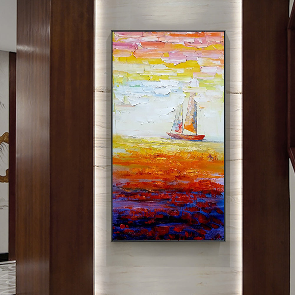Hand Painted Oil Painting Sailboat Modern Abstract Landscape Decorative Painting Thick Oil Knife Painting On Canvas,27inx54in,No Frame