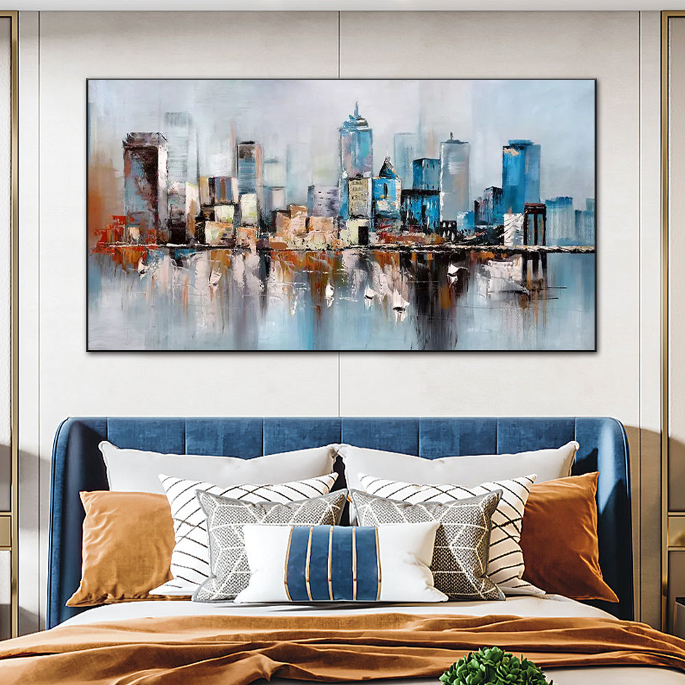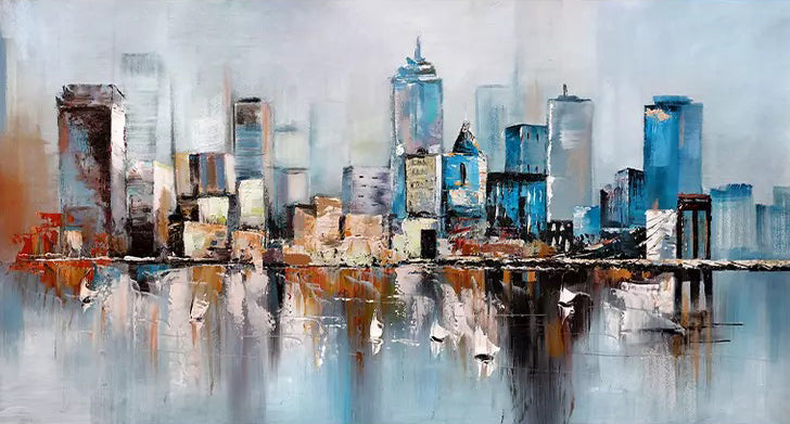 Handmade Oil Painting On Canvas Modern Abstract Wall Art NY City Building Skyline Grey Oil Painting,27inx54in,No Frame