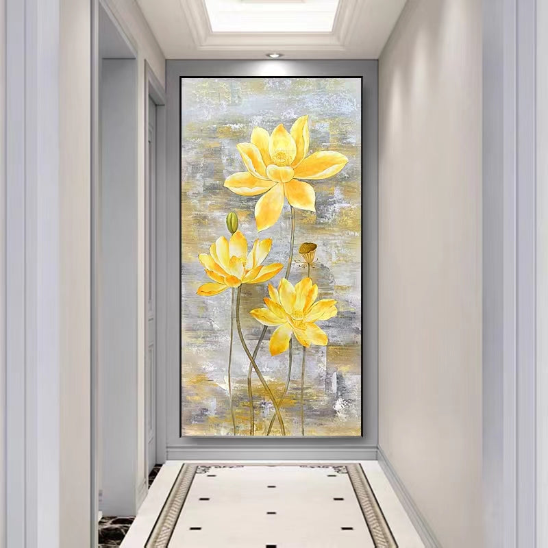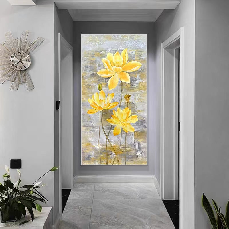 Lotus Flower Oil Painting Retro Hallway Living Room Background Wall Decorative Painting Hand painted Abstract Texture,27inx54in,No Frame