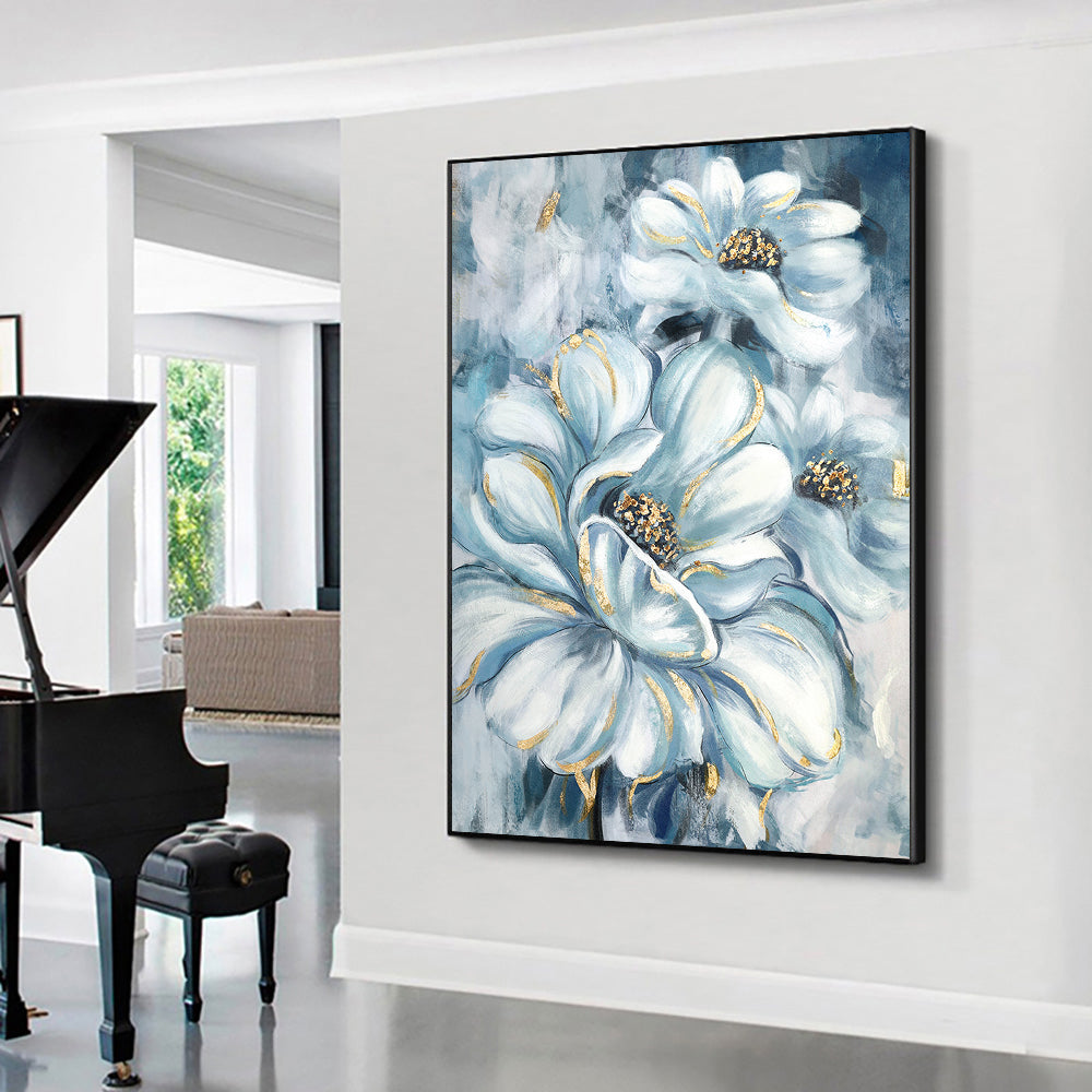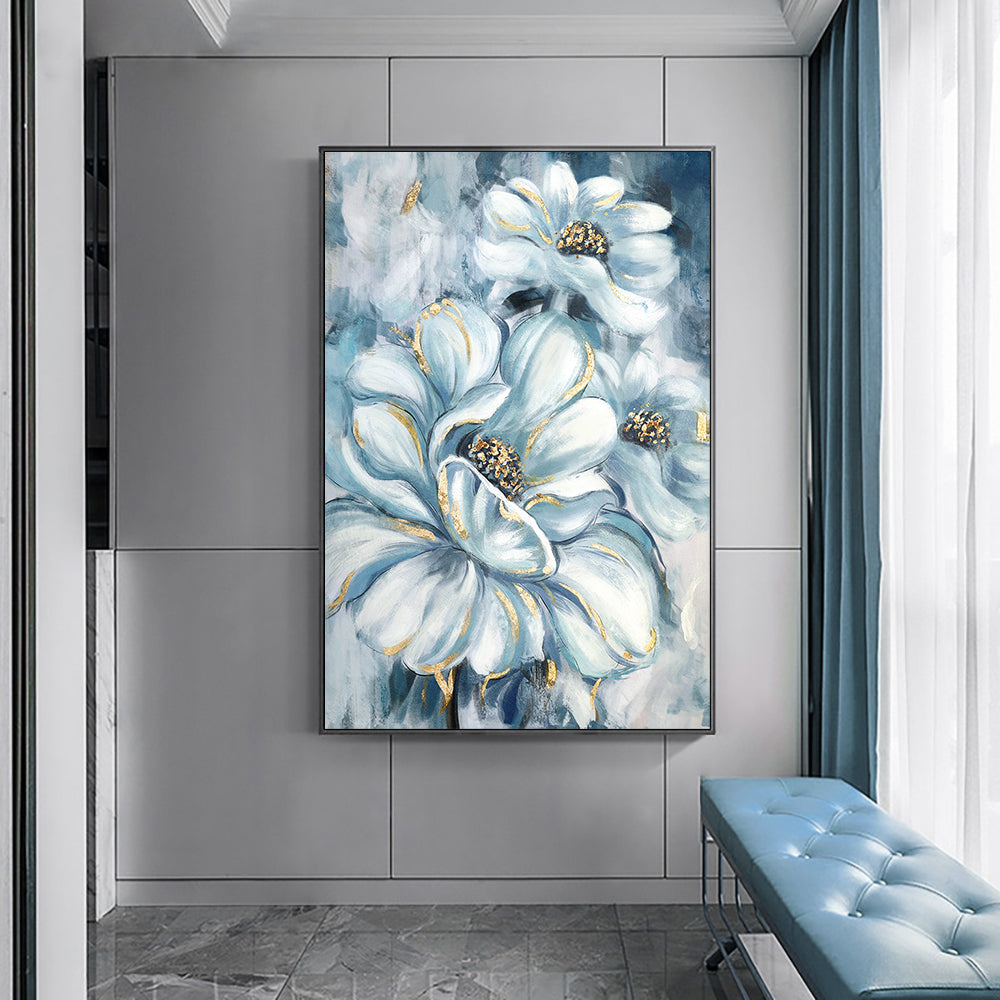 Morden Abstract White Luxury Flower Oil Painting Canvas Wall Art Hand Paint Original Golden Oil Painting Wall Art For Home Living Room,31inx47in,No Frame